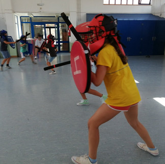 Foi uma tarde divertida como podem ver pelas fotografias , divertiram-se e acharam ser pouco. Assim fizemos duas tardes, uma com 150 e outra com apenas 105 pequenos participantes. Numa das tardes não resistimos á tentação de levar equipamento para pessoas grandes e equipamos os monitores, foi interessante... e, espero que também se tenham divertido. Obrigado á equipa da Academia de Esgrima Histórica, a Bia a Inês e ao Martim dos Gladiadores que estiveram presentes nesta atividade. grato pela visita da Vera Rebelo da Federação Lohan Tao Kempo. Obrigado ao Pedro Madeira pela oportunidade e um especial agradecimento aos seus colaboradores e monitores pelo apoio e atenção.